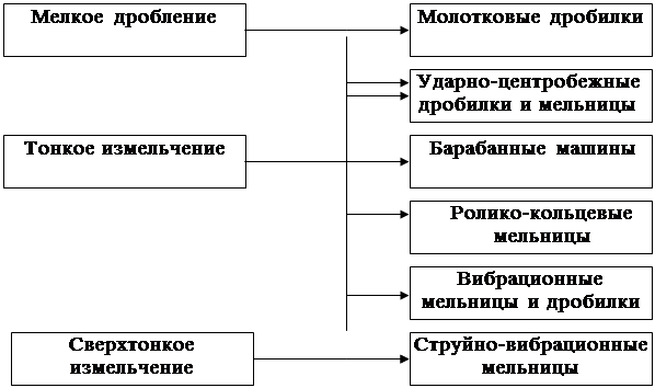 Крупное, среднее и мелкое дробления осуществляют в дробилках сухим способом, а тонкое коллоидное измельчения – сухим и мокрым способом. При мокром дроблении уменьшается пылеобразование и получают частицы, более однородные по размеру, облегчается также выгрузка материала.