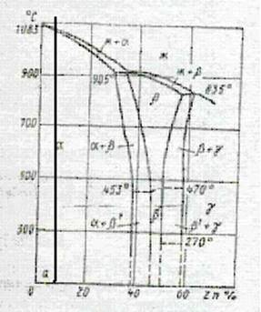 Рисунок 6.2 Диаграмма состояния медь-цинк (отмечена латунь с содержанием цинка 9 %)