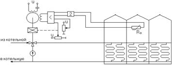 Схема стабилизирует температуру воздуха в остеклённых блочных теплицах с водяной системой обогрева. Температура воздуха регулируется за счёт изменения температуры теплоносителя с помощью смесительного клапана. Основное возмущающее воздействие – изменение температуры наружного воздуха. Датчик температуры воздуха в теплице – термометр сопротивления. На схеме: 2 – измерительный блок, преобразующий величину сопротивления датчика температуры в электрическое напряжение. Устройство сравнения выполнено на дифференциальном усилителе.