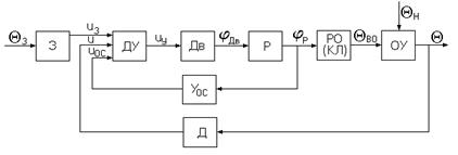 Устройство местной обратной связи (УОС) выполнено в виде потенциометрического датчика перемещения, подвижный контакт которого механически связан с выходным валом редуктора. Входной сигнал УОС – угол , выходной – напряжение .