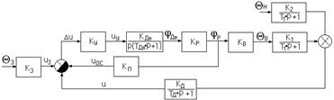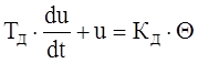 При отклонении температуры в теплице от заданной, на вход ДУ поступает разность напряжений . Усиленное напряжение подаётся на электродвигатель, который через редуктор поворачивает клапан и тем самым изменяет расход воды через вентиль Θ, м2