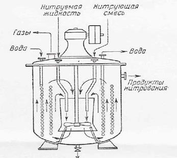 Такой нитратор представляет собой чугунный, или выполненный кислотоупорной стали котел с змеевиками и быстроходной пропеллерной мешалкой, помещенной внутри направляющего вертикального стального цилиндра. Бензол и нитрующая смесь непрерывно поступают через трубки в центральную часть нитратора смешиваются с его содержимым, скользят снизу вверх, омывая змеевики, а затем сверху вниз через направляющий цилиндр. Избыток реакционной смеси непрерывно отводится из штуцера в верхней части нитратора.