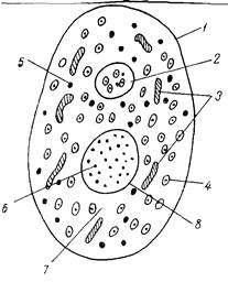 Рис.2 Строение дрожжевой клетки: 1-оболчка; 2-ядро; 3-митохондрии;4-рибосомы; 5-гликоген; 6- волютин; 7-протоплазма;8-вакуоль