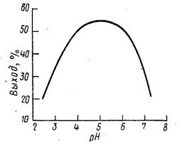 Следует различать рН среды, поступающей в инокулятор для выращивания дрожжей (сусла), и рН бражки в инокуляторе, т. е. рН, при котором растут дрожжи. Оба параметра нерасчетные, они подбираются опытным путем. рН сусла выбирается на основании условий, обеспечивающих наибольшую его доброкачественность и наименьшую агрессивность, а также из условий растворимости отдельных компонентов. Для сусла, получаемого путем гидролиза растительных материалов, принят рН в пределах 3,8—4,2. рН выращивания или рН бражки в инокуляторе обусловливается совершенно иными факторами, он должен: гарантировать оптимальные условия развития дрожжей; не являться оптимальным для биологических примесей, например таких, как бактерии; быть оптимальным для поддержания в растворенном состоянии всех компонентов сусла. рН, при котором дрожжи могут существовать в развиваться, колеблется в очень широких пределах: от 2,5 до 8,0. Эти пределы сильно зависят от других условий выращивания, таких, как температура, доброкачественность среды, возраст дрожжей, аэрация. Оптимальный рН, т. е. тот, при котором дрожжи, быстро развиваясь, дают высокий выход биомассы, лежит в гораздо более узких пределах. При слишком низких и слишком высоких значениях рН выход дрожжей уменьшается. Графически зависимость выхода дрожжей от рН можно представить кривой с максимумом, как это изображено на рис. 4.