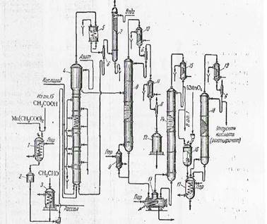 Уксусная кислота (сырец), непрерывно отбираемая из расширенной части окислительной колонны 4, поступает в ректификационную колонну 8, в которой из сырца отгоняются низкокипящне соединения. Освобожденная от низкокипящих примесей уксусная кислота непрерывно поступает в кипятильник 13 ректификационной колонны 14, где при 125° С уксусная кислота испаряется, отделяясь от катализатора, паральдегида, кротоновой кислоты и продуктов осмоления. Пары уксусной кислоты конденсируются в дефлегматоре 15, откуда часть кислоты возвращается на орошение колонны 14, некоторое количество направляется в аппарат 1 для приготовления катализаторного раствора, а большая часть поступает для очистки от примесей в реактор 16. Здесь уксусную кислоту обрабатывают перманганатом калия для окисления содержащихся в ней примесей.