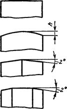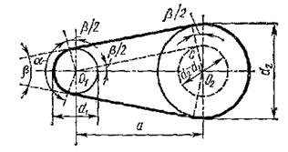 Клиноремінная і поліклинова передачі. У цих передачах корисне навантаження передається за рахунок сил тертя між бічними поверхнями паса трапецієдального перетину і канавок шківа (рис. 1.3, б). Через заклинюючу дію клиноремінна передача в порівнянні з плоскоремінною володіє більшою тяговою здатністю. Внаслідок цього при однаковій передаваній потужності вона вимагає меншого натягнення, створює менший тиск на вали і опори, допускає малі кути охопленя на шківах і тому застосовується при великих передавальних числах і менших міжосьових відстанях. Клиноремінна передача краще пристосована для безступінчатого регулювання швидкості, для чого шківи виконують у вигляді розсувних дисків.