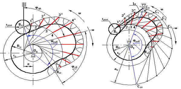 . Отримані крапки 1*,2*,3*… з'єднують плавною кривою й одержують центровий чи теоретичний профіль. Для побудови робочого профілю необхідно знати радіус ролика штовхальника. Якщо він не заданий, то його вибирають з конструктивних розумінь: