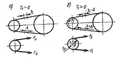 Плоскоремінна передача. У цій передачі корисне навантаження передається за рахунок сил тертя між внутрішньою поверхнею ременя і поверхнею шківа (рис. 1.3, а). Сила тертя розосереджена по всій ширині ременя, що забезпечує рівномірне навантаження всіх його елементів. Ремінь - найбільш тонкий і гнучкий елемент прямокутного перетину. Передача допускає застосування шківів найменших діаметрів. У порівнянні з іншими механічними передачами, плоскоремінна передача забезпечує найбільш спокійний хід без вібрації. Ця перевага робить її у ряді випадків незамінною, особливо в точних верстатах.
