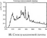 В качестве источника света в фотоплоттерах могут использоваться лазерные и световые, например, ксеноновые лампы. У ксеноновых ламп спектр излучения шире, чем у монохромного лазера (рис. 10). Поэтому в них могут использоваться обычные фотоматериалы, сенсибилизированные к видимой части света. Ксеноновая лампа имеет большой срок эксплуатации (более десяти лет при круглосуточном использовании или 10» вспышек) и имеет максимальное излучение в диапазоне 400–560 нм (синий-голубой-зелёный спектр). Она излучает очень короткие (менее 3 микросекунд) и мощные импульсы света. Активная жидкокристаллическая матрица (LCD) модулирует свет вспышки согласно данным рисунка фотошаблона, которые покадрово на ней воспроизводятся при перемещении фотоголовки.