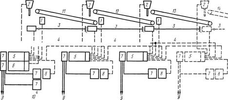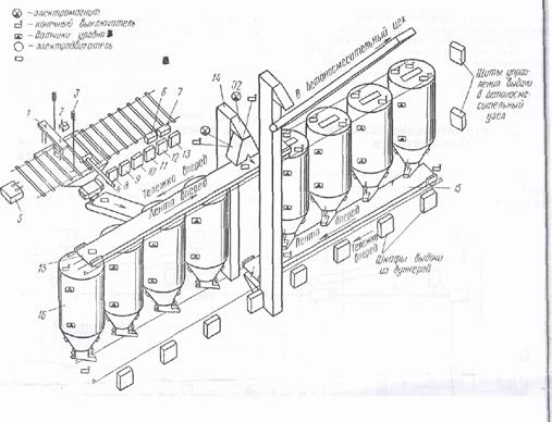 Уровень материала в бункерах контролируется реле уровня РУ1, РУ2 и РУЗ. Выбор того или иного бункера для его за грузки осуществляется ключами выбора с пульта диспетчера.