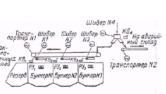 При переполнении всех выбранных для загрузки бункеров шиберы автоматически закрываются, диспетчеру подается аварийный сигнал, и, если в течение некоторого времени диспетчер не примет необходимых мер, включается предупредительная звуковая сигнализация, запускается транспортер, подающий материал на склад, и переводится шибер № 4 в положение «На склад».