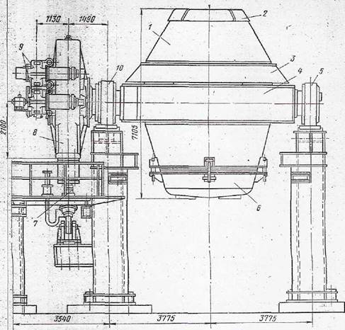 Для остановки бочки и удержания ее при любом угле поворота имеются два тормоза TKП 400; каждый тормоз обеспечивает необходимый тормозной момент. К выходному валу редуктора подсоединен командоаппарат КА4168-4 через понижающую ступень специального кинематического редуктора. Вторая повышающая ступень подсоединена к механическому реле оборотов, контролирующему скорость поворота бочки. Воздух из цехового воздухопровода подводится через воздушную сальниковую головку 12. Сферическая поверхность головки позволяет без нарушения герметичности поворачивать конвертор при несовпадении, его оси вращения с осью стационарной части системы подачи воздуха (цеховой), а также компенсировать температурное удлинение бочки. Переходное соединительное колено закреплено на крышке бочки при помощи телескопической опоры.