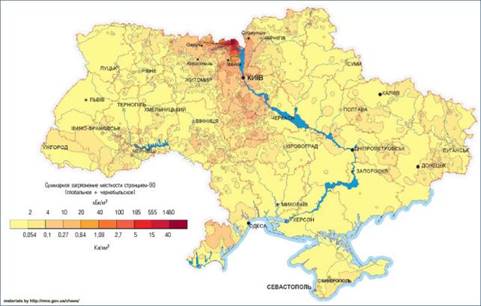 Рис.2 Сумарне забруднення території України стронцієм-90 [3]