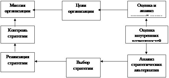 Реализация такого пути связана с разработкой стратегии деятельности организации, в которой определяются главные цели и задачи, их ресурсное и финансовое обеспечение, пути и методы достижения целей и решения возникающих проблем. Стратегическое планирование является важнейшей функцией стратегического управления и его центральным звеном в относительно стабильных условиях внешней среды. Структура процесса стратегического менеджмента, характерна для таких условий, представлена на рисунке 1.1 [2, с. 289].