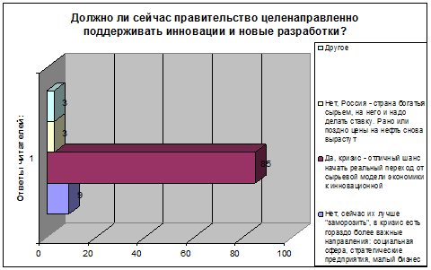 Переход на инновационное развитие России требует восприимчивости всего общества к инновациям и наличия достаточного количества кадров, способных управлять инновационным процессом и осуществлять реализацию инноваций. Здесь хотелось бы отметить результаты следующего опроса:
