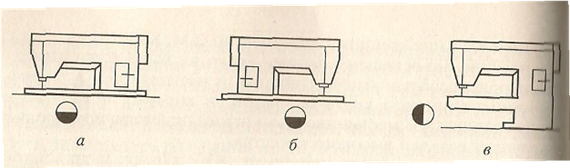 Рис.1. Виды машин по расположению головки относительно оператора (а — праворукавные, б — леворукавные, в — фронтальные).