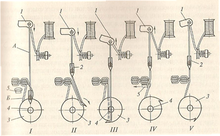 Технологическая схема образования челночного стежка 1 — нитепритягиватель, 2 — игла, 3 — челнок, 4 — шпулька, 5 — механизм перемещения материалов, А — верхняя (игольная) нитка, Б — нижняя (челночная) нитка.