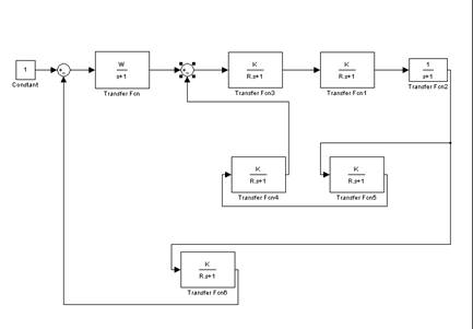 Алгоритмічна схема системи показана на рис 6.9 за допомогою отриманих передатних функцій був зроблений розрахунок перехідних процесів системи