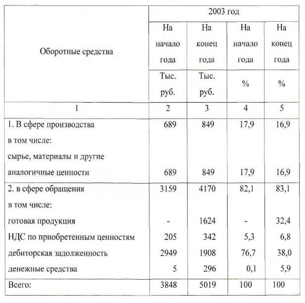 Все оборотные средства имеют тенденцию к уменьшению с 5019 тыс. руб. в 2003 году до 2318 тыс. руб. в 2004 году и 1112 тыс. руб. в 2005 году. Так происходит за счет ускорения оборачиваемости оборотных средств тем самым, экономя оборотные средства, как в сфере производства, так и в сфере обращения. Это повлияло и на прибыль предприятия в лучшую сторону.