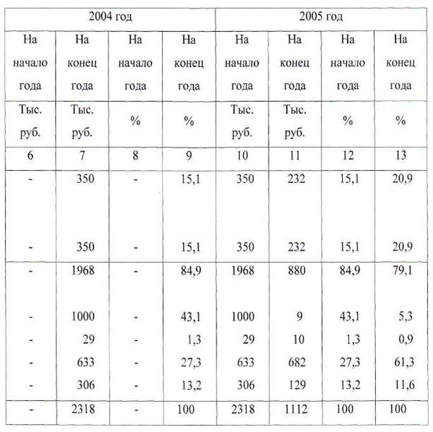 Из таблицы 1 видно, что в 2003 году наибольший удельный вес в структуре оборотных средств на начало и конец года занимала дебиторская задолженность соответственно 76,7% и 38%. Это говорит о том, что большая часть оборотных средств была изъята из оборота, тем самым не дало возможность произвести и реализовать больше продукции и выручить большую прибыль. В 2004 году произошло преобразование организации ОАО «Маслодел» со смешанной формой собственности в ООО «Молоко» с частной формой собственности, то данные по оборотным средствам на начало 2004 года отсутствуют, отсюда следует, что 2004 год будем анализировать по показателям только на конец года. Отсюда получаем: наибольший удельный вес в структуре оборотных средств на конец 2004 года занимала готовая продукция - 43,1%. Это показывает, что предприятие не смогло рационально реализовать готовую продукцию. Следовательно, на начало 2005 года наибольший удельный вес занимала готовая продукция тоже 43,1%, а на конец года дебиторская задолженность 61,3%. Это значит, что в этом году большая часть оборотных средств была снова изъята из оборота, тем самым отрицательно повлияла на производство. Оборотные средства в сфере производства в денежных единицах с 2003 года по 2005 год уменьшаются, а в процентном - уменьшаются, с 4170 тыс. руб. до 880 тыс. руб. и с 83,1% до 79,1% соответственно. Такое соотношение говорит, что предприятие эффективно использует оборотные средства в сфере обращения, и рационально в сфере производства. Денежные средства в 2004 году возросли до 306 тыс. руб. с 296 тыс. руб. в 2003 году, а в 2005 году составили 129 тыс. руб. Дебиторская задолженность уменьшилась с 1908 тыс. руб. в 2003 году до 633 тыс. руб. в 2004 году, а в 2005 году она выросла до 682 тыс. руб. Готовая продукция и НДС по приобретенным ценностям уменьшаются.