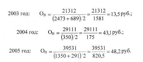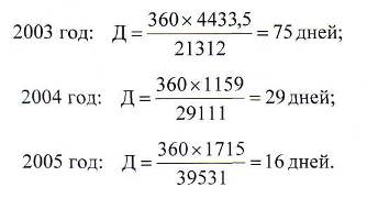 Мы видим, что продолжительность одного оборота оборотных средств уменьшилась с 75 дней в 2003 году до 29 дней в 2004 году и 16 дней в 2005 году. Так происходит за счет увеличения числа оборотов. Следовательно, увеличиваются скорость одного оборота, объемы реализации продукции, повышается прибыль.