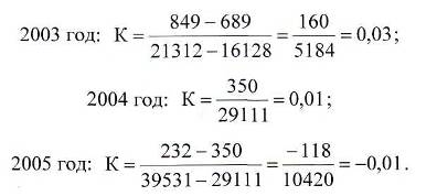 Из расчетов видно, что данный коэффициент уменьшился с 0,03 в 2003 году до 0,01 в 2004 году, а в 2005 году составил -0,01. Это случилось из-за того, что прирост товарной продукции положительный, и он идет на много быстрее, чем прирост нормируемых оборотных средств в 2003 и 2004 годах, а в 2005 году прирост нормируемых оборотных средств отрицательный. Значит, что эффективность использования нормируемых оборотных средств с каждым годом повышается, в результате уменьшения нормируемых оборотных средств.