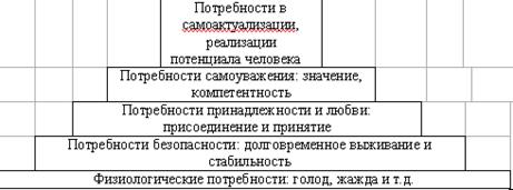 Однако возможно и другое понимание: мотивация – это совокупность мотивов поведения и деятельности. В этом случае для оценки мотивации используются те же динамические параметры – сила и устойчивость, что и при оценке мотива. Наряду с ними используются и другие – множественность, структурность, иерархичность. Множественность характеризует развитость содержания, то есть достаточное число мотивов. Примером этому служит известная иерархия мотивов А. Маслоу, которая открывается физиологическими потребностями, включает в себя потребности безопасности, потребности любви, самоуважении и завершается потребностями самоактуализации[7]
