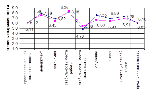 Таким образом, на первые места по важности испытуемыми, имеющими четкие представления о карьере, были вынесены деньги, карьера, стабильность и оценка работы компанией, в то время как в группе испытуемых, имеющих нечеткие представления о карьере, были вынесены такие факторы, как условия труда, оплата, содержание работы и оценка своего труда. Это говорит о том, что для испытуемых, имеющих четкие представления о карьере, в результате высокой конкуренции на рынке труда и жесткого отбора при поступлении на работу гораздо более важно обеспечить свое финансовое благополучие и устойчивость в социальной и организационной среде, а для испытуемых, имеющих нечеткие представления о карьере, наличествует непонимание своих целей и потребностей в работе, результатом чего является низкая удовлетворенность трудом и отличия в трудовой мотивации.