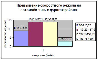 из данной статистической сводки видно, что при проведении мероприятий по выявлению нарушения скоростного режима на автомобильных дорогах района чаще всего регистрировалась скорость от 116,25 км/ч до 158,75 км/ч. Меньше всего при проведении мероприятий по выявлению нарушения скоростного режима на автомобильных дорогах района меньше всего регистрировалась скорость от 158,75 км/ч до 180 км/ч.