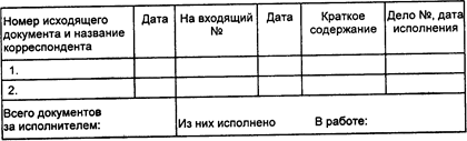 Когда документ исполнен, на обратной стороне карточки делается отметка об исполнении, указывается, как решен вопрос, за каким номером и когда отправлен документ. Документ считается исполненным тогда, когда полностью выполнены поставленные в нем или указанные в резолюции задания. Если в процессе решения вопроса документ передавался от одного исполнителя к другому, все это также фиксируется на оборотной стороне карточки.