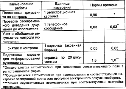 Представляют интерес нормы времени на контроль исполнения документов, включающие проставление пометки «К» на документе, подлежащем контролю, контроль исполнения документа, напоминание о сроке исполнения исполнителю, внесение сведений в карточку о ходе исполнения, информирование руководителей о состоянии исполнения, снятие документа с контроля, подготовку сводки документов, не исполненных в срок, составление сводки об исполнении документов, подлежащих контролю; обобщение результатов исполнения документов в структурных подразделениях, анализ состояния исполнения документов в организации*.