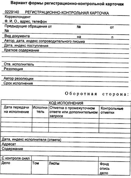 Суть регистрации — внесение в компьютер или запись на карточке основных поисковых признаков документа и сведений о заявителе (см. вариант формы). При использовании автоматизированной системы регистрационная карточка на обращения заполняется на экране компьютера.