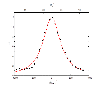 wwбула проведена серія вимірювань форми лінії Is(), у якій взаємна орієнтація зондуючої хвилі і одній з ГИК накачувань залишалася постійною на вході кристала, а кут падіння інший ГИК накачування мінявся від постанова до постанову. Типовий вид окремої форми лінії розсіяння приведений на рис.17. На нижній осі абсцис відкладений розлад просторового синхронізму прямого процесу, на верхній осі абсцис відкладений кут повороту кристала. Лінія розсіяння має один яскраво виражений максимум з кутовою шириною порядка 0.50, в одиницях хвилевих розладів - 600 см-1 . Проте, по ширині цієї лінії не можна визначити величину поглинання, оскільки істотна расходимость променів. Було перевірено, що при зменшенні расходимости першого збудливого променя зменшується ширина лінії розсіяння. Також в інтенсивність сигналу складається розсіяння на сусідніх частотах з певним розладом, оскільки збуджується поляритон з частотною шириною порядка 5 см-1. Кожна серія подібних вимірювань форми лінії Is(), знята при фіксованому вугіллі q