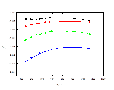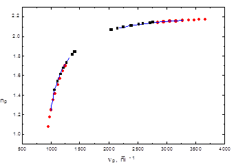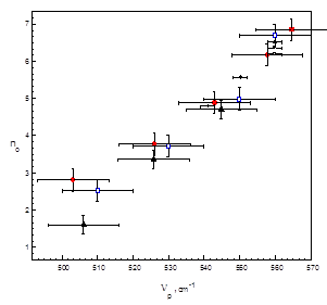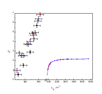 Набутих за допомогою чотирьох хвилевої методики значень звичайного показника заломлення на частоті 560 см-1 для кристалів з різною концентрацією магнію рівні: no(0.41масс.%Mg) =6.53, no(0.68масс.%Mg) =6.37, no(0.79масс.%Mg) =6.2. Основну частку до погрішності вимірювання no вносить точність вимірювання частоти лазера, що перебудовується і частотна ширина його генерації. Проте, при фіксованій частоті поляритону точність вимірювання частоти цього лазера на помилку величини зміни показника заломлення не впливає. Тому в даному випадку помилка вимірювання зміни показника заломлення залежно від концентрації домішки не перевищує ±0.02. Таким чином, ми можемо сказати, що на верхньому фононному поляритоні виявляється аналогічна залежність, як і у видимому діапазоні: при збільшенні концентрації приміси показник заломлення падає.