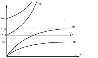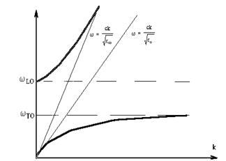 - фундаментальна частота оптичного коливання грат. На рис.1 приведена дисперсійна крива відповідна рівнянню (2). Якби поперечні механічні коливання і електромагнітні хвилі були незалежні, то перші описувалися би прямими.