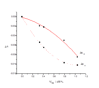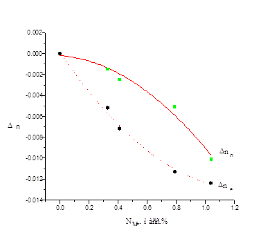 1. Отримані залежності показників заломлення у видимому і ближньому інфрачервоному діапазоні від концентрації домішки магнію. Концентрація домішки магнію мінялася в межах 0-1%.