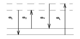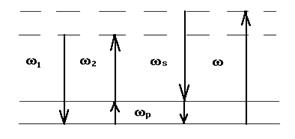 У більшості виконаних раніше робіт використовувалася традиційна схема КАРС-СПЕКТРОСЬКОПІЇ, в якій одне з накачувань є двічі виродженим з погляду процесу чотирьох хвилевого зміщення, і реєстрація сигналу ведеться на антистоксовій частоті. В даному випадку використовувався найбільш загальний варіант чотирьох хвилевої взаємодії, в якій всі хвилі мають різні частоти і реєструється стоксова компоненту розсіяного випромінювання. Схема експериментальної установки приведена на рис.16. Джерелами хвиль збудливого випромінювання з частотами w1