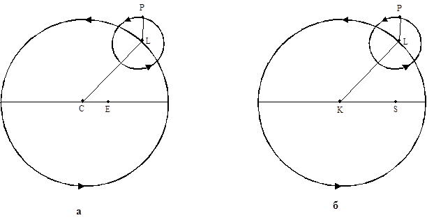 а – построения Птолемея. Земля находится в точке Е, а планета – в точке Р, которая двигается по кругу с центром L. В свою очередь центр L двигается вокруг Е по иному кругу, центр которого не совпадает с Е.