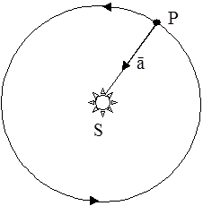 Рисунок 1.5. Поскольку планета Р движется по круговой орбите, а Солнце находится в центре, то сила взаимодействия между Солнцем и планетой и центростремительно ускорение направлены по радиусу.