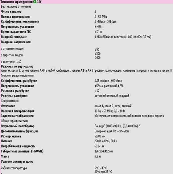 Осцилограф С1–166 (універсальний аналоговий осцилограф)призначений для дослідження електричних сигналів у смузі пропущення 0 – 50 МГЦ шляхом візуального спостереження форми електричних сигналів на екрані електронно-променевої трубки, виміру їх амплітудних і тимчасових параметрів по шкалі екрана. Може використовуватися для ремонту, обслуговування й діагностики неполадок радіоелектронної апаратури, у тому числі й на важкодоступних об'єктах. Прилад характеризується зручністю в роботі й при обслуговуванні, міцністю конструкції, високою тимчасовою й температурною стабільністю, мінімальною вагою й габаритними розмірами.