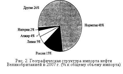 Уже в 2005 г. объемы импорта нефти в страну впервые превысили показатели внутренней добычи, а в 2006 г. такие же изменения коснулись и газовой отрасли. Подобная ситуация ведет к тому, что к 2020 г. 80% потребностей Великобритании в энергоносителях будут удовлетворяться за счет импорта. Следовательно, теоретически страна в будущем может практически полностью оказаться в нефтяной зависимости от Норвегии, на которую сегодня приходится около половины общего объема импорта нефти (рис. 2). По прогнозам, в 2020 г. Норвегия также будет обеспечивать около трети объемов поставок газа на внутренний британский рынок, которые планируется осуществлять главным образом через подводный газопровод "Лангелед", который введен в эксплуатацию в 2006 г. "Лангелед" - самый длинный (1200 км) в мире подводный газопровод, соединяющий восточное побережье Великобритании с западным побережьем Норвегии.