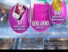 | Камера снимает девушку, которая поднимается на эскалаторе. Камера установлена наверху этой платформы. По мере того, как поднимается девушка, камера поднимается вверх. На фоне этого торгового центра появляются призы – 10 мобильных телефонов, 100000 рублей, 100 рублей на мобильный. |