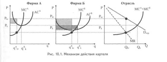 Наиболее ярко выраженной формой реализации кооперативного поведения является картель, представляющий собой соглашение о параметрах отраслевого предложения. Склонность фирм к согласованию своих действий посредством формального соглашения об объеме выпуска и цене производимого отраслью продукта обусловлена трудностями диагностирования реакции конкурентов. Содержательной стороной картельного соглашения является ограничение отраслевого выпуска до уровня, обеспечивающего получение фирмами отрасли монопольной прибыли, что достигается посредством координации выпуска отдельных фирм до объемов, которые суммарно обеспечивали бы установление монопольного равновесия.
