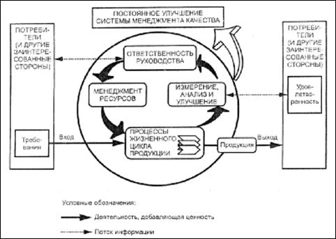 Приведенная на рис. 6 модель системы управления качеством, основанная на процессном подходе, иллюстрирует связи между всеми процессами. Эта модель показывает, что потребители играют существенную роль при определении входных данных. Мониторинг удовлетворенности потребителей требует оценки информации о восприятии потребителями выполнения их требований.