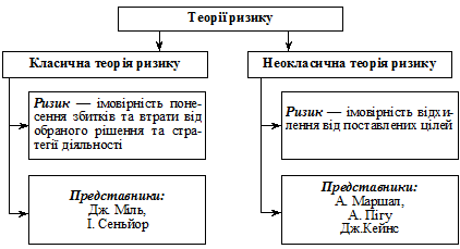 - "стрімчак, скеля" і пов’язується, у першу чергу, з появою небезпеки або непевності в будь-якій сфері господарської діяльності та суспільно-економічного життя. У сучасній західній економічній літературі розглядають дві теорії ризику: класичну та неокласичну (рисунок 1.1).
