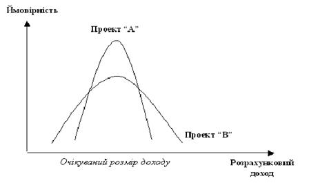 З графіку видно, що розподіл ймовірностей проектів "А" і "В" мають однакову величину розрахункового доходу, однак в проекті "А" крива розподілу вужча, що свідчить про менший рівень коливання варіантів розрахункового доходу відносно очікуваної величини доходу, а отже і про менший рівень ризику цього проекту.