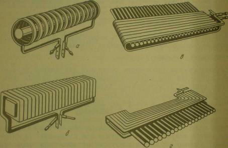 Для нагрева заготовок по всей длине применяют соленоидные многовитковые проходные индукторы круглого, квадратного или прямоугольного сечения (рис. 1, а и б), для местного нагрева концов длинных заготовок (прутки, трубы) – овальные и щелевые (рис. 1,