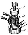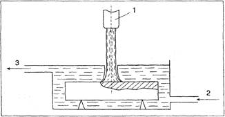 Рис.3.2 Схема процесу плазмового зміцнення в рідких середовищах: 1 - плазмотрон; 2 - введення води; 3 - виведення води