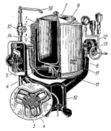 Пространство между наружным кожухом и корпусом пароводяной рубашки заполняется теплоизоляцией. На наружном кожухе закреплены две цапфы – левая и правая, вращающиеся в съемных подшипниках, смонтированных на чугунной станине. На правой стойке станины в одном корпусе с подшипником находится, червячная передача с маховиком, с помощью которого котел опрокидывается во время разгрузки. Через правую цапфу проходит трубка, соединяющая пароводяную рубашку с узлом контрольно – измерительной арматуры. Последняя состоит из заливной воронки с краном, служащим для залива воды в кожух пароводяной рубашки, электроконтактного манометра, с помощью которого осуществляется автоматическое регулирование процесса нагрева, предохранительного клапана, срабатывающего при повышении давления в пароводяной рубашке свыше 0,5 кг/см2