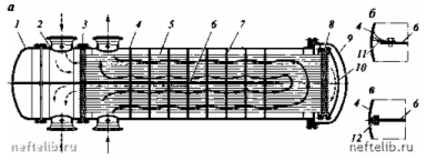 а - общий вид; б, в - варианты уплотнения продольной перегородки с корпусомстальными пластинами и асбестовым шнуром; 1 - крышка распределительной камеры; 2 -распределительная камера; 3 - неподвижная трубная решетка; 4 - кожух; 5 - труба; 6 -продольная перегородка; 7 - поперечные стержневые перегородки (турбулизаторы); 8 –подвижная трубная решетка; 9 - крышка кожуха; 10 - крышка плавающей головки; - стальные пластины; 12 - асбестовый шнур.